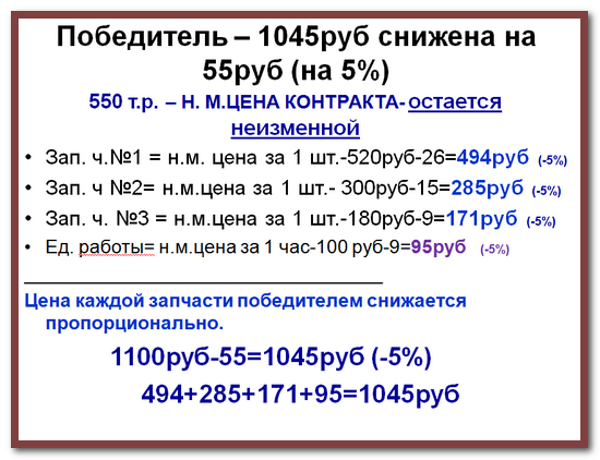 После проведения торгов идет снижение общей стоимости запасных частей и определяется процент снижения. Затем стоимость каждой запчасти, выставленной на торги снижается на этот процент.