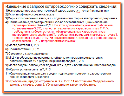 Как видим, это не торги, а значит и процедура проведения гораздо короче. Если минимально для проведения конкурса необходимо 50-60 дней, для электронного аукциона 35-40 дней (25 дней для короткого при начальной цене до 3 миллионов рублей), для запроса котировок необходимо всего 12-18 дней. Не надо разрабатывать документацию с обязательными требованиями, установленными законом. Достаточно составить извещение о запросе котировок .