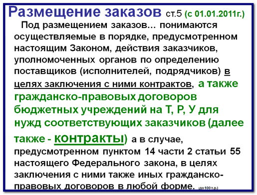 Свои разъяснения я буду делать строго по статьям Федерального закона от 21 июля 2005г. N 94-ФЗ «О размещении заказов на поставки товаров, выполнение работ, оказание услуг для государственных и муниципальных нужд». Статья 5 закона определяет цель размещения заказов.